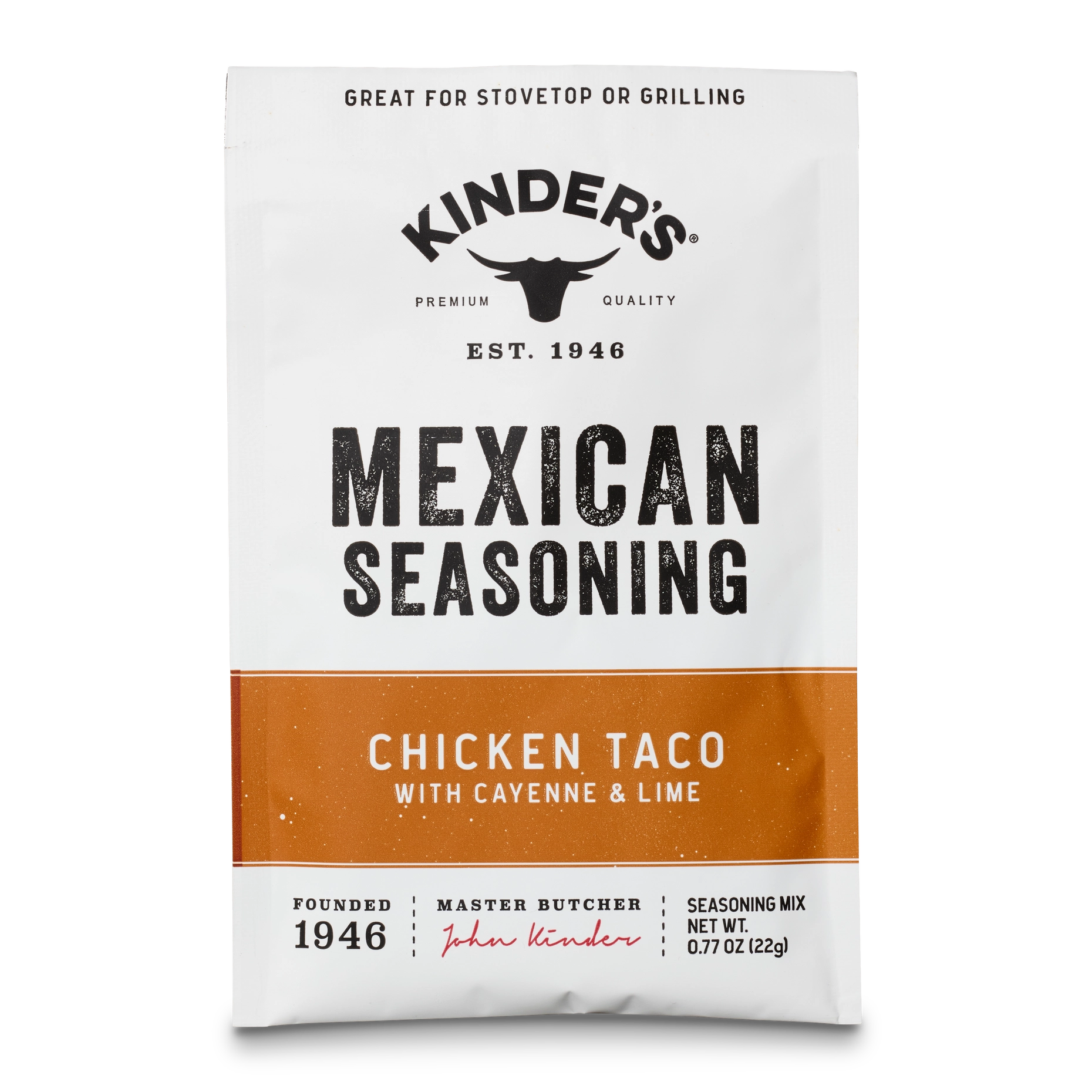 Kinder's new Chicken Taco Seasoning is our signature blend inspired by the traditional Mexican flavors of pollo asado-style grilled chicken. It is a blend of garlic, onion, mild chili, herbs, and spices that will make chicken the star of the taco. Try it with ground chicken for an easy weeknight meal. Or sprinkle it on grilled chicken and give them pollo asado tacos or fajitas. We can’t wait for you to try it.